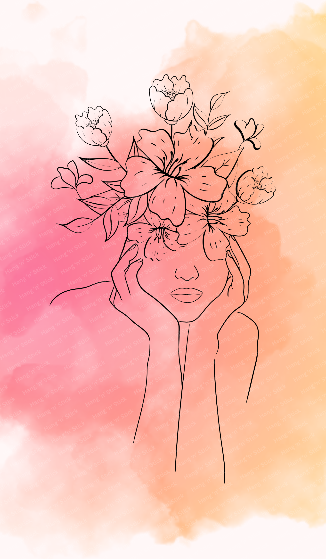 Celebrate beauty, creativity, and imagination with Floral Daydream Wall Art, a captivating digital design that merges minimal line drawing with a dreamy watercolor background. The artwork features a serene feminine figure crowned with blooming flowers, set against a soft gradient of pink, peach, and orange hues. The result is both modern and poetic, balancing bold simplicity with artistic depth.