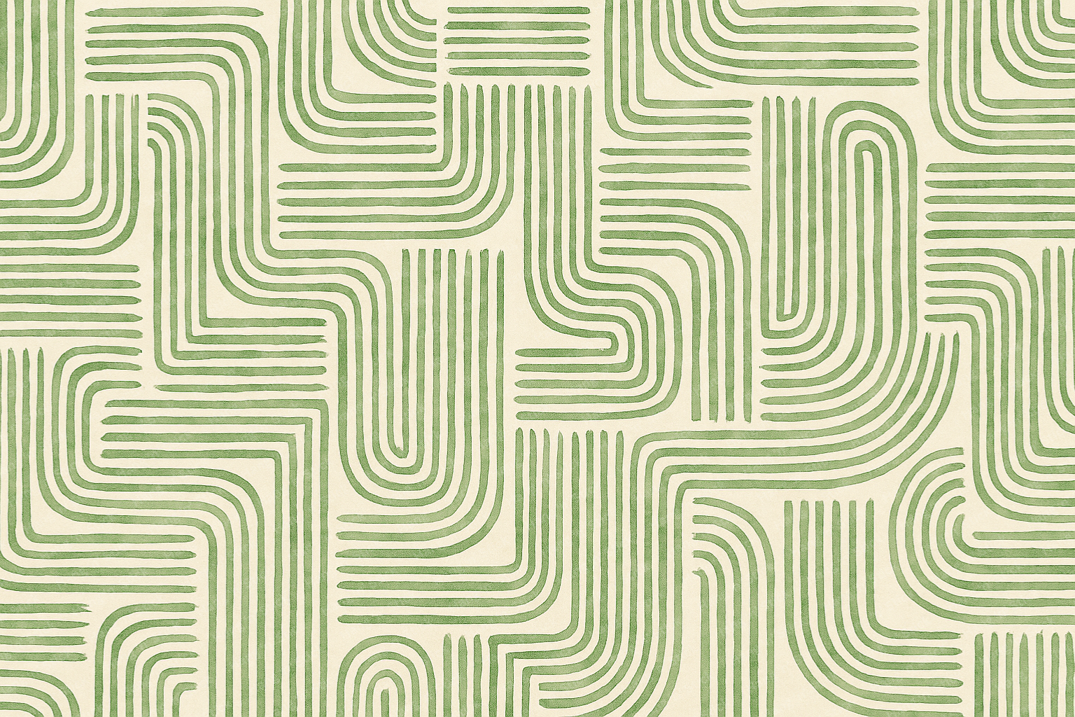 This retro-inspired kitchen wall mural features a striking green geometric line pattern against a neutral background, blending mid-century modern charm with contemporary design. The rhythmic curves and repeating patterns create a sense of balance and movement, making it an ideal choice for kitchens, dining rooms, and open cooking spaces. Its versatile green tone pairs effortlessly with wood, white, or natural stone finishes, adding a refreshing pop of color while maintaining a cozy atmosphere.