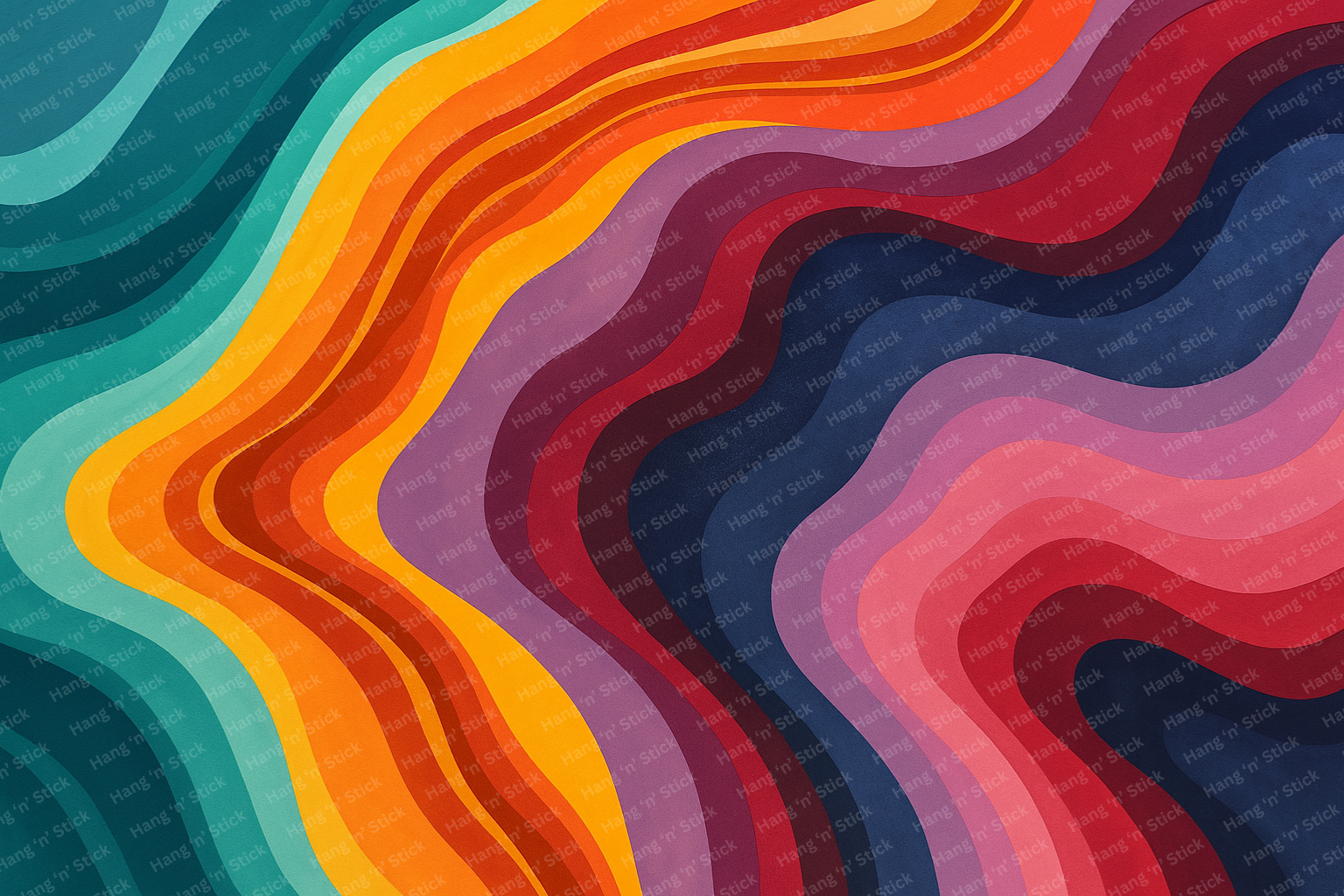 The Retro Color Layers Living Room Wall Mural brings bold design to your walls with its layered, wavy lines in teal, mustard, orange, red, and purple. Inspired by retro-modern aesthetics, this vibrant piece adds energy and movement, making it an eye-catching focal point in any living room, lounge, or creative workspace.